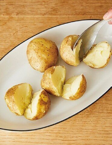 器にじゃがいもをのせ、スプーンなどで食べやすい大きさに割り、(2)をかけ、ごまをふる。