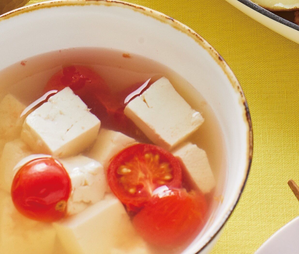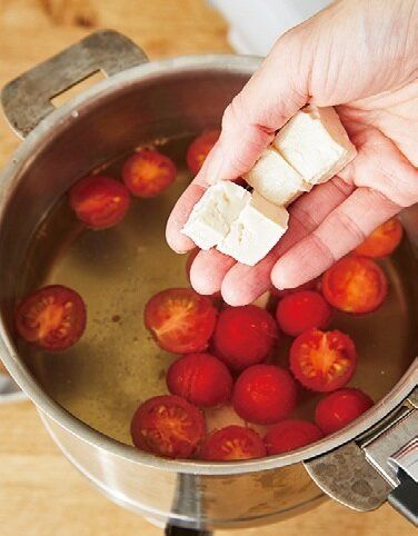 ミニトマトは半分に切る。豆腐は3cm角に切る。鍋にだし汁とミニトマトを入れ、中火にかける。