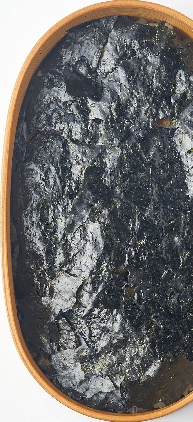 (3)のりの半量を重ねてのせ、残りのご飯、(1)、のりを重ねる。