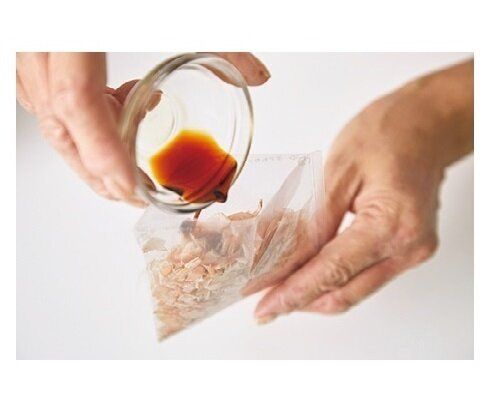 (1)削り節の袋にしょうゆを入れ、混ぜる。