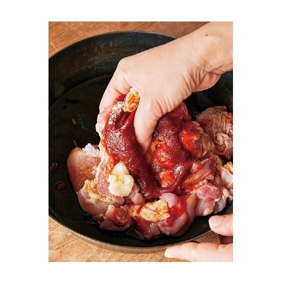 大根は皮つきのまま厚さ8mmの半月切りにする。鶏肉は一口大に切って浅い鍋またはフライパンに入れ、[A]を加えてもみ込んで、大根を加えて混ぜ、広げる。