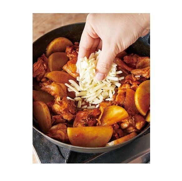 へらで料理を縁に寄せて鍋の中心を空け、チーズを入れる。ふたをしてチーズが溶けるまで約2分蒸し焼きにする。