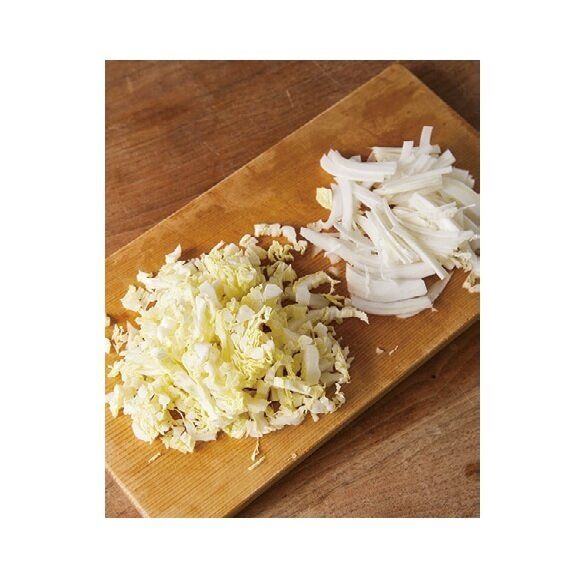 わかめは水に浸してもどす。白菜は、下のほうの白い軸の部分は長さ5cmに切って縦にせん切りにし、葉の部分は幅約8mmの細切りにしてボウルに入れる。