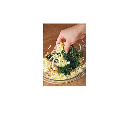 [A]を加えて混ぜ、手でぎゅっと押さえながらもむ。しんなりしたら、わかめ、[B]を加えて混ぜる。