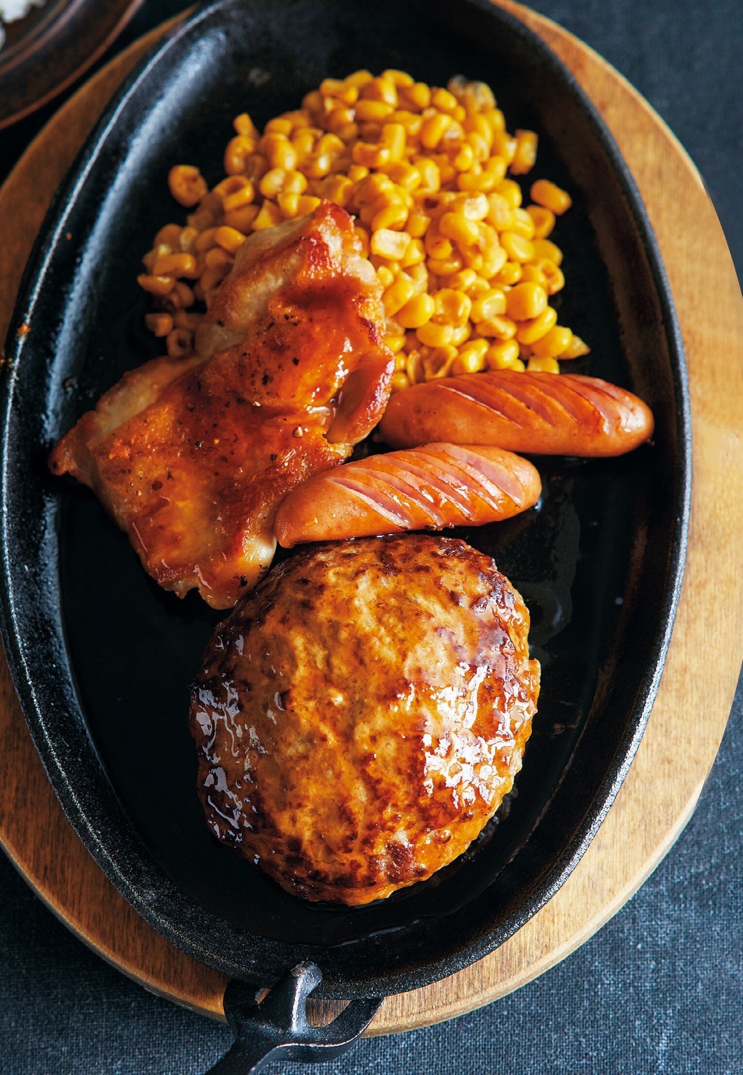別のフライパンに照り焼きソースの材料を入れて中火にかけ、混ぜながら煮立たせ、とろみをつける。ハンバーグとチキンソテーにかけ、ソーセージとコーンを添える。