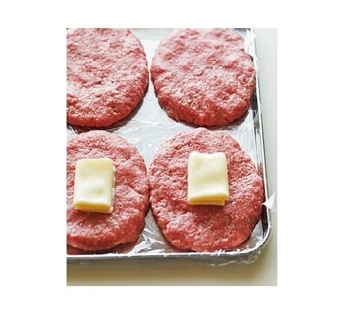 スライスチーズは半分に折り、さらに三つ折りにして肉だねの中央にのせ、もう1枚ではさむ。
