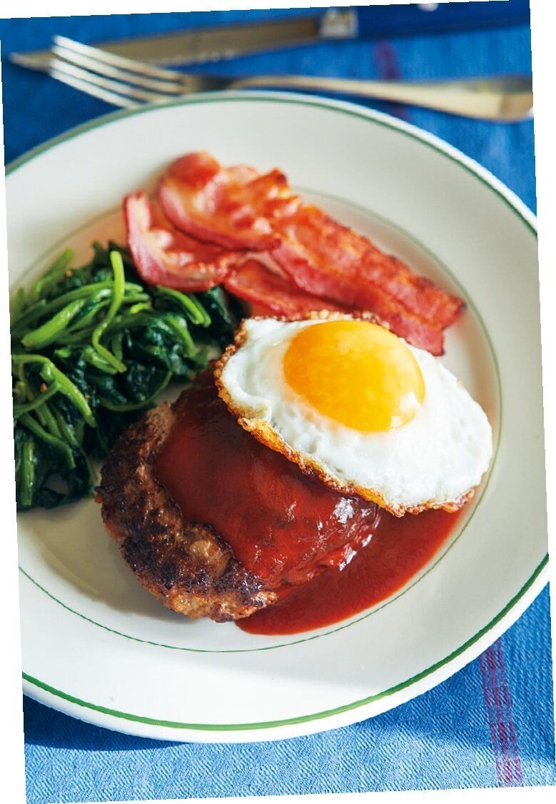 (2)のフライパンをきれいにし、ケチャップソースの材料を入れて中火にかけ、バターを溶かしながら約1分煮つめる。ハンバーグにかけ、カリカリベーコン、目玉焼き、ほうれん草のソテーを添える。