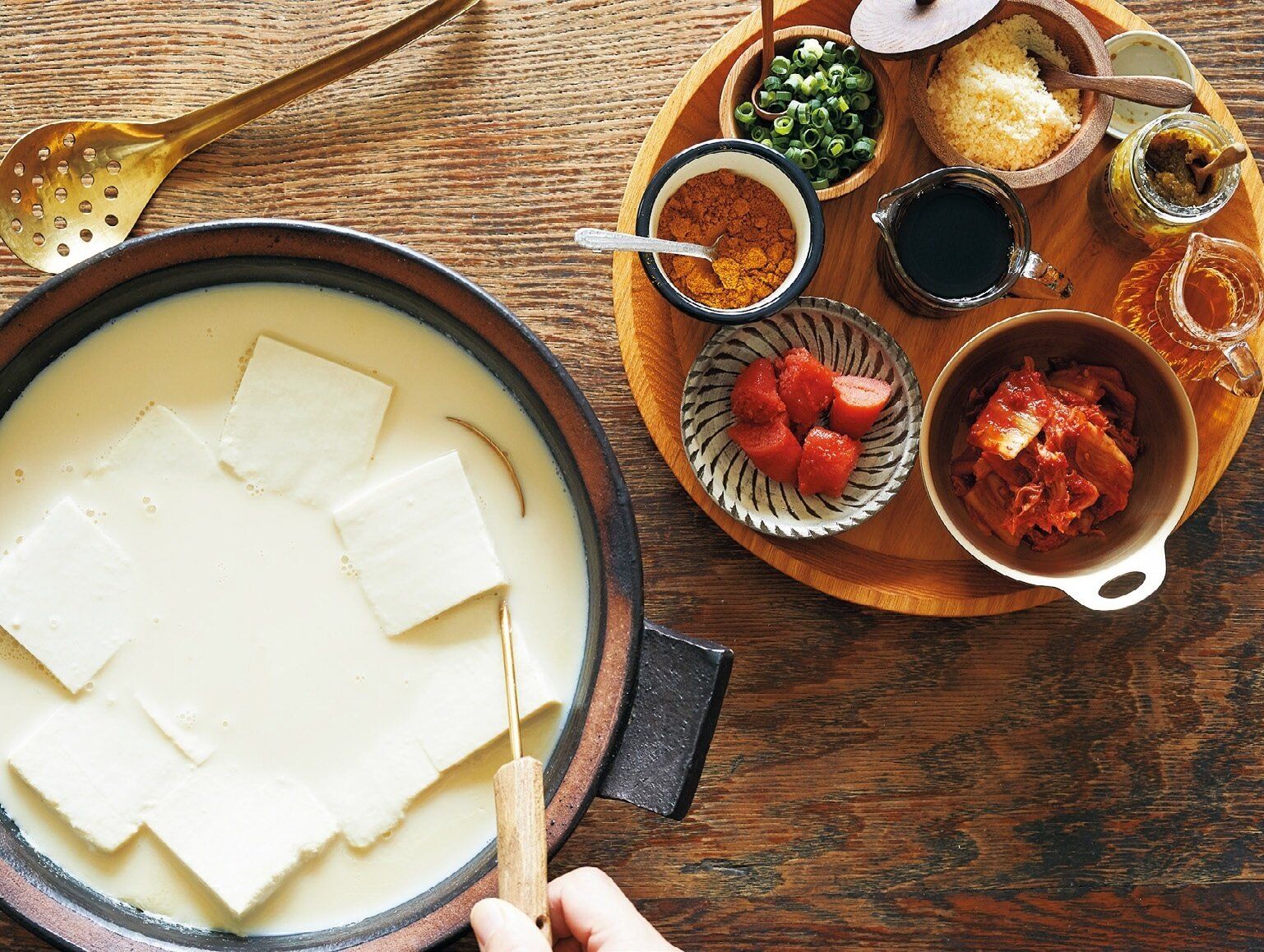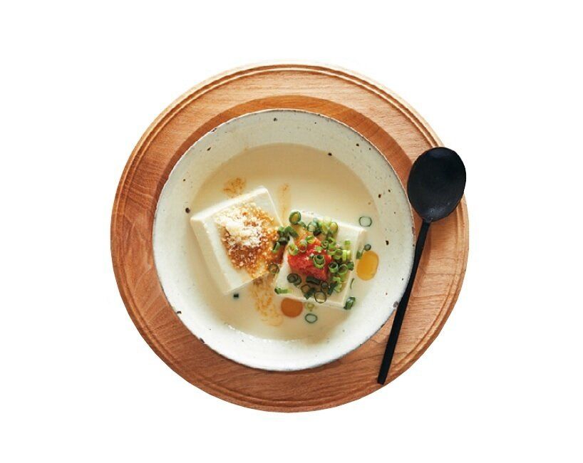 (2)豆乳を加えて沸騰直前まで温めたら器に入れ、好みのトッピングをかけて食べる。