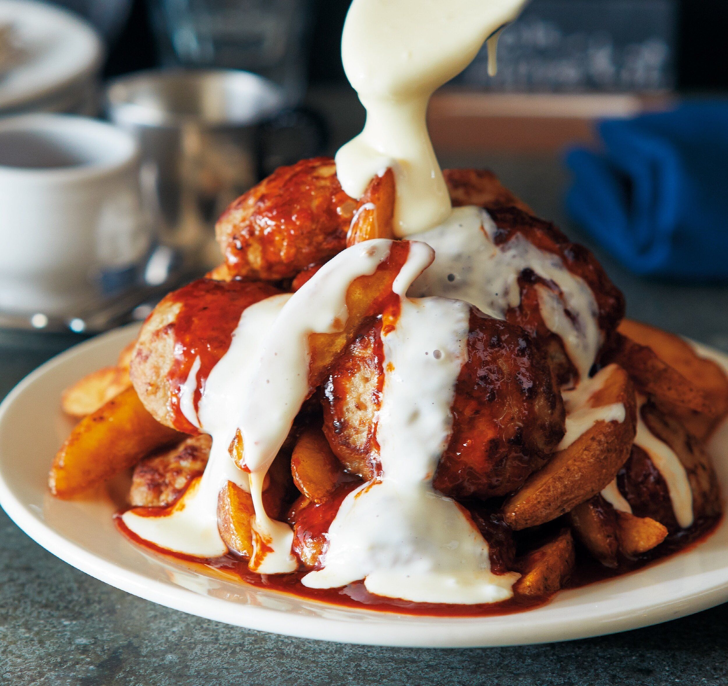 器に(2)、フライドポテトを混ぜて山積みに盛り、コチュジャンソースとチーズソースをかける。