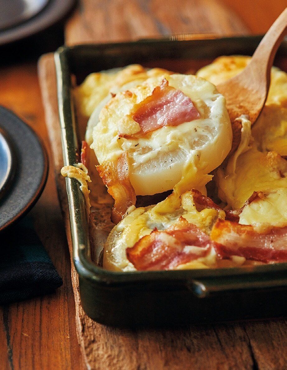 大根に塩、こしょうをふって耐熱の器に並べる。表面にマヨネーズを塗り、チーズの半量を散らし、ベーコンを重ね、残りのチーズをふる。