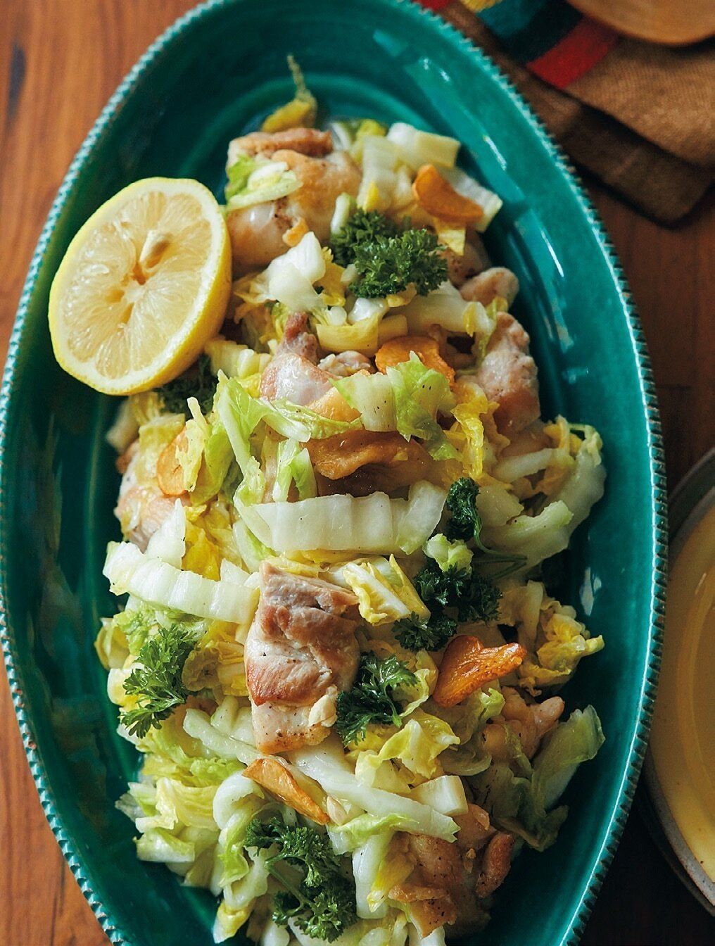 (2)のフライパンに鶏肉を入れて中火で4~5分焼き、裏返して3~4分、色よくカリッと炒め、パセリをちぎって入れ、さっと炒めて火を止める。白菜を加えて混ぜ、器に盛り、(2)のにんにくを散らし、レモンを添える。