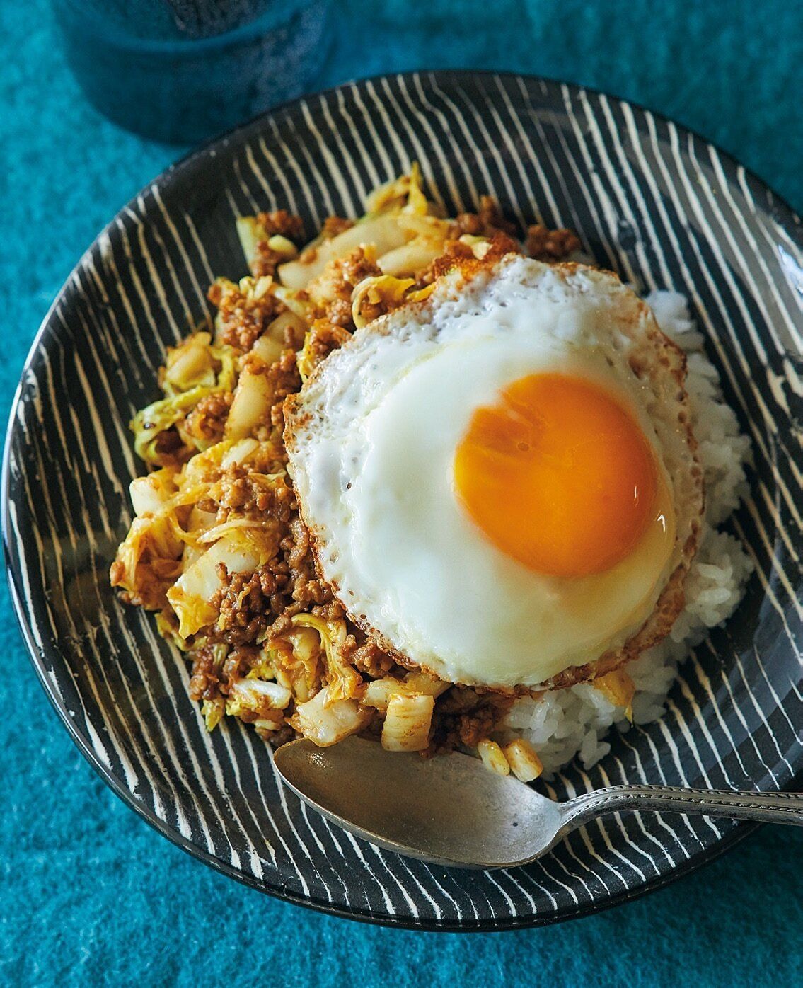 器にご飯を盛って(1)を盛り、好みで目玉焼きをのせる。
