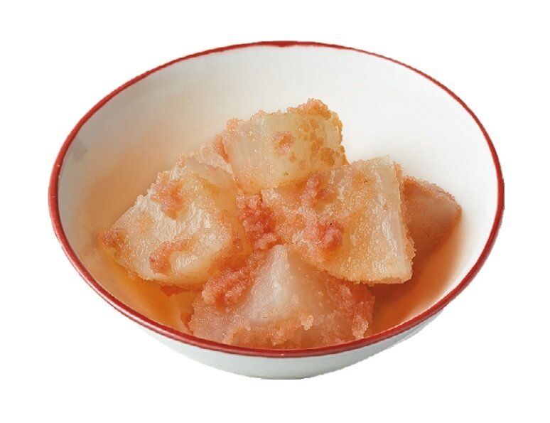 4等分に切ったゆで大根を、ほぐして水少々でのばしたたらことあえる。