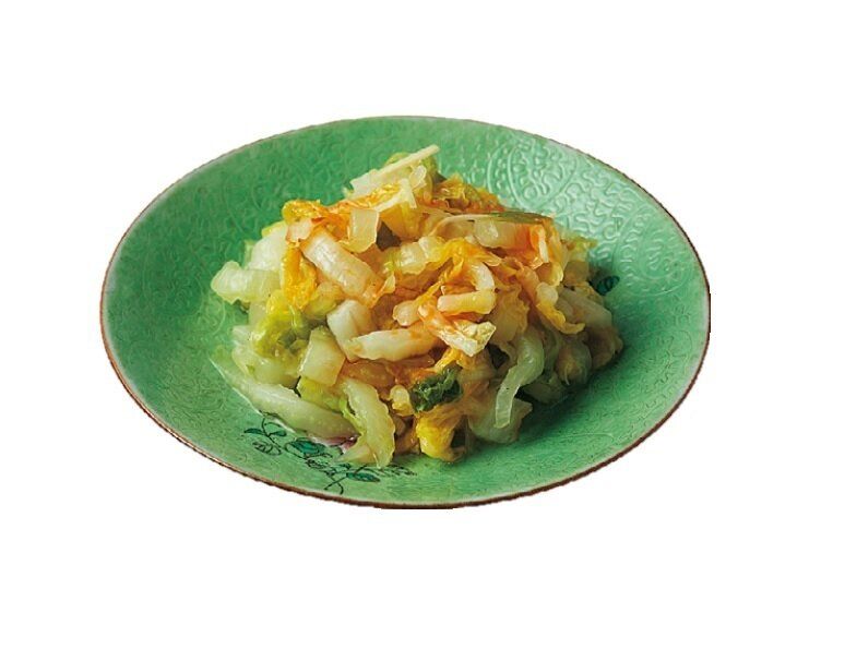塩白菜を酢、砂糖、しょうがのせん切り少々とあえ、ラー油をかける。