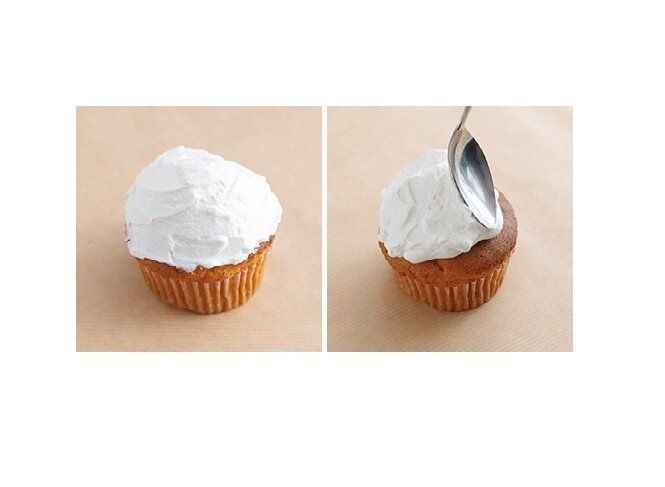 ケーキの上にホイップクリームをのせ、スプーンで表面をならしてドーム状にしたら好みでデコって。