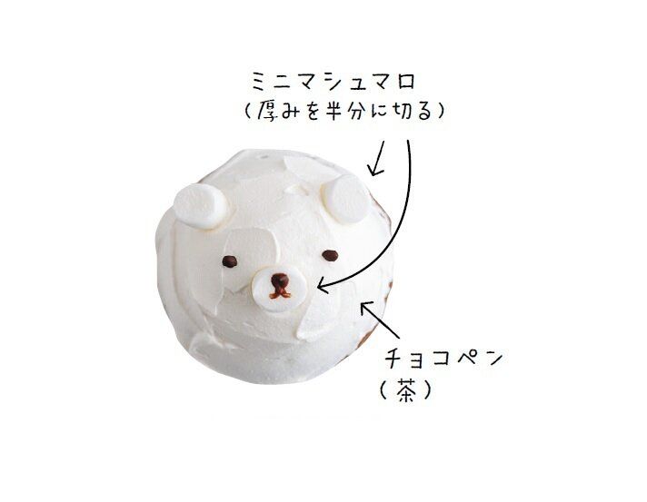 (1)厚みを半分に切ったミニマシュマロを、耳と鼻に見立て3カ所にトッピング。