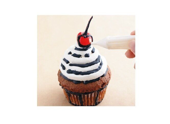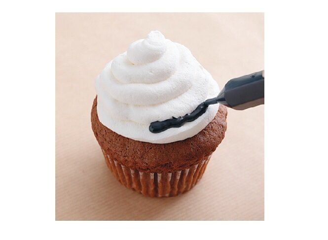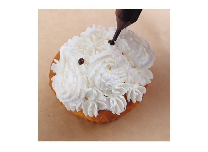 (1)ホイップクリームを渦巻き状に絞り出してへこんだ部分にチョコペン(黒)で太めの線を描く。