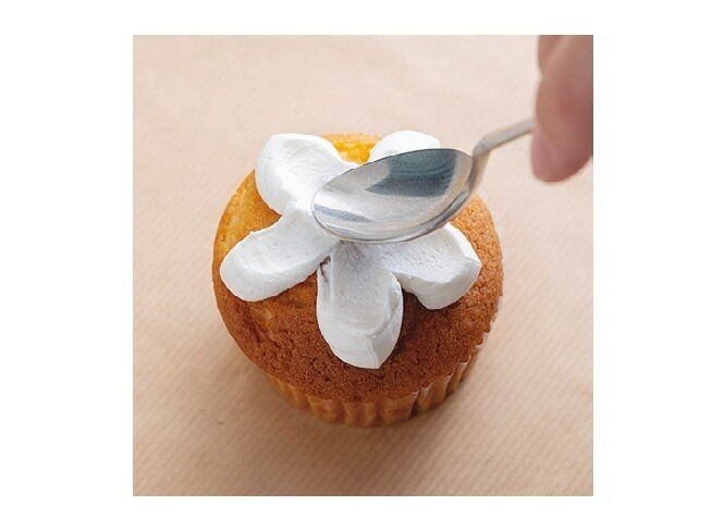 (2)スプーンの背で花びらの真ん中を1つずつへこませる。