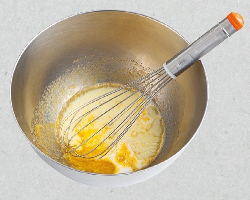ボウルに卵を割り入れ、砂糖を加えて泡立て器でよく混ぜ、牛乳、サラダ油を加えて、さらに混ぜる。