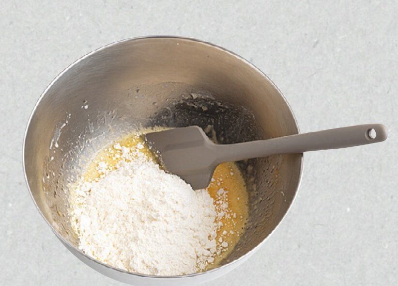 ホットケーキミックスを加え、ゴムべらでさっくり混ぜる。