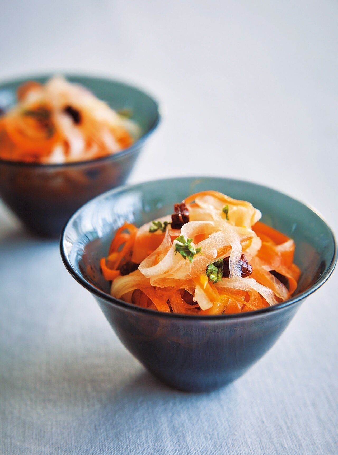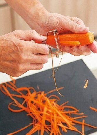 にんじんに切り込みを入れ、ピーラーで引くと見め麗しい薄~い細切りに。表面積が広く、ドレッシングがなじみやすい。