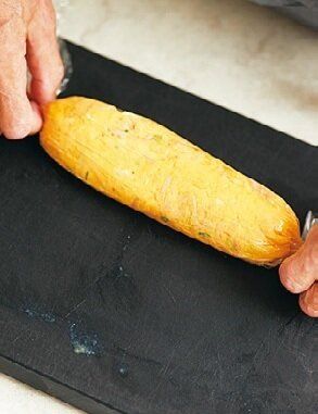 (3)ラップを広げて(2)が熱いうちにのせ、直径4~5cmの筒状に包む。ころがして形を整えて粗熱を取り、幅約3cmに切る。器にケチャップを塗って盛る。