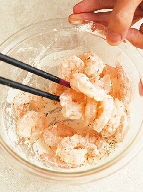 (2)えびは水けを拭き、塩小さじ1/2 、こしょう少々をふり、混ぜた[A]をまぶす。フライパンに揚げ油を深さ3cm入れて中温(170度)に熱し、えびを揚げ、油をきってさまし容器に入れる。