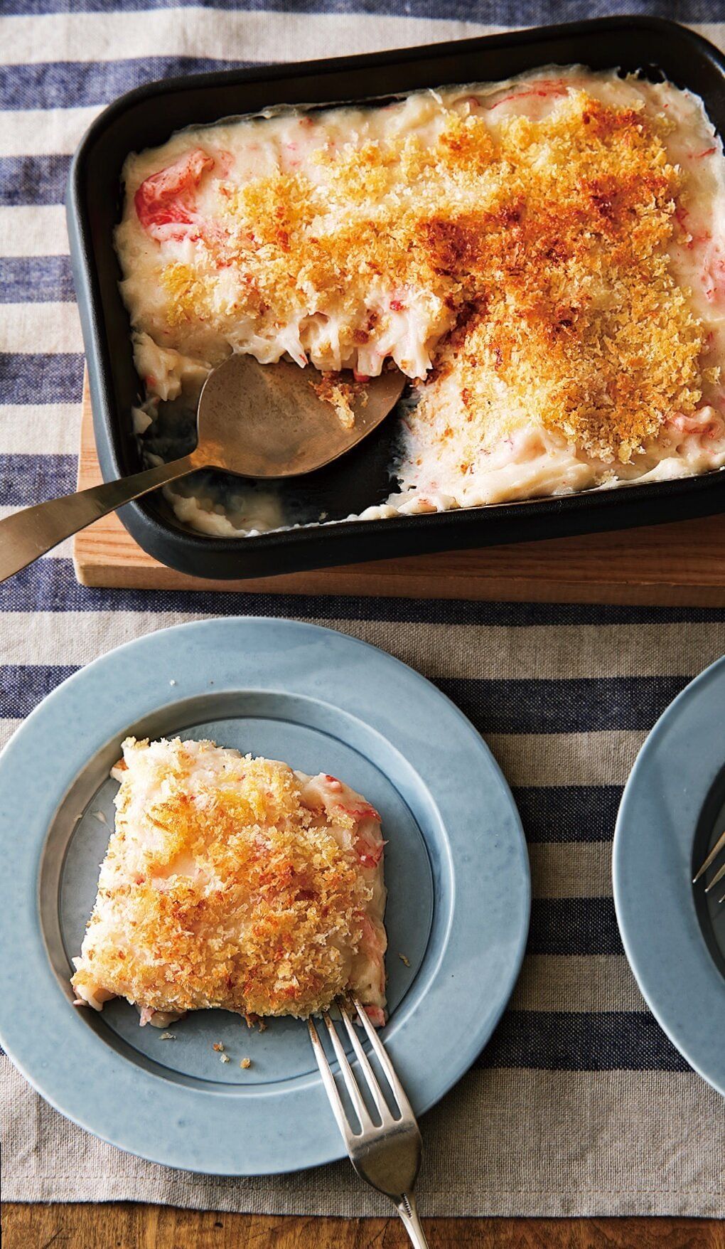 (1)にホワイトソース、[A]を加えて混ぜ合わせる。かに風味かまぼこも加え、さっと混ぜる。