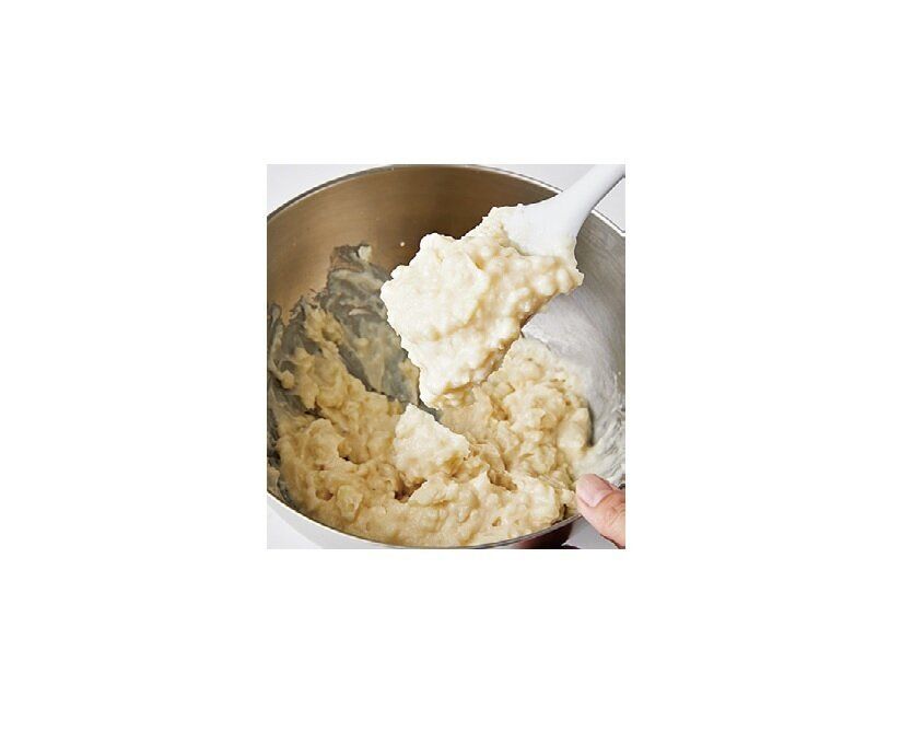 かにポテトクリームの牛乳は、いちどに加えず様子をみながら加える。へらで持ち上げたときにぎりぎり下に落ちない程度のゆるさになればよい。
