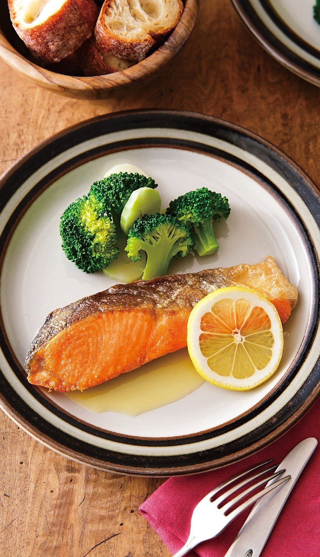 フライパンに油を中火で熱し、(1)をトングなどで立てて皮を約1分焼く。こんがりと焼けたら表になる面を約2分焼き、返して弱めの中火で約1分焼く。余分な脂を拭いてバターを溶かし、フライパンを傾けてバターを鮭にかけて香りをつけ、器に盛る。フライパンをきれいに拭き、[A]のバターを弱火で溶かし、レモンの絞り汁を加えてさっと混ぜ、鮭にかける。レモン、(2)を添える。