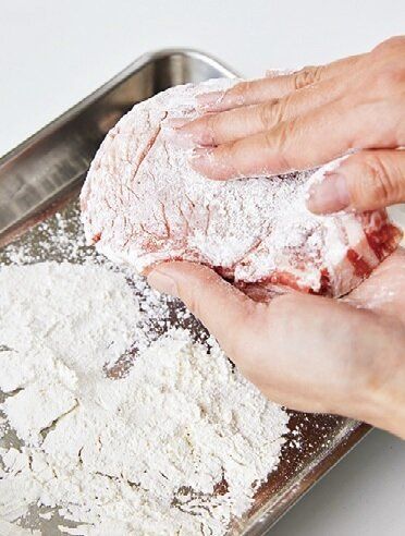 マッシュルームは薄切りにする。豚肉は筋を切って塩小さじ1/2、こしょう少々をふり、薄力粉適量を薄くまぶす。