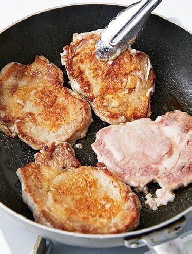 フライパンに油大さじ1/2を中火で熱し、豚肉を並べ入れ、約3分焼く。こんがりとしたら返し、弱めの中火にして約2分焼き、器に盛りつける。