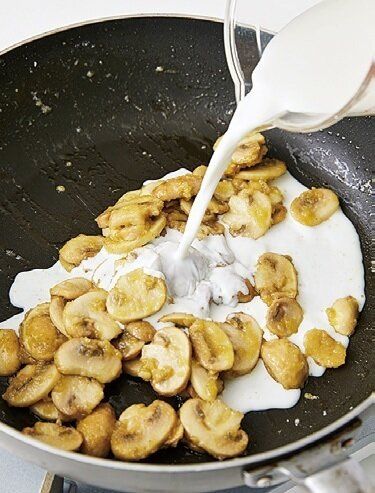 市瀬さん きのこをしんなり炒めたら小麦粉をなじませることですね。牛乳を加えて混ぜながら火を通すうちに、とろみがついてソースができるんですよ。