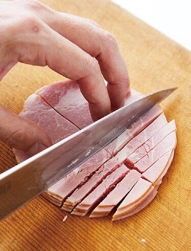 キャベツは小さめの一口大、ハムは横半分に切ってから幅5mmに切る。