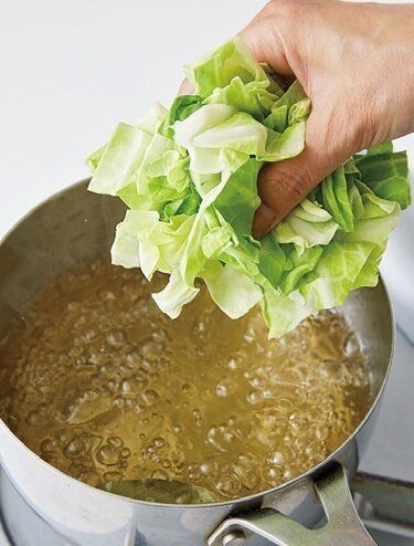 鍋に[A]を入れて中火にかける。煮立ったら(1)を加え、キャベツがしんなりとするまで弱めの中火で約5分煮る。