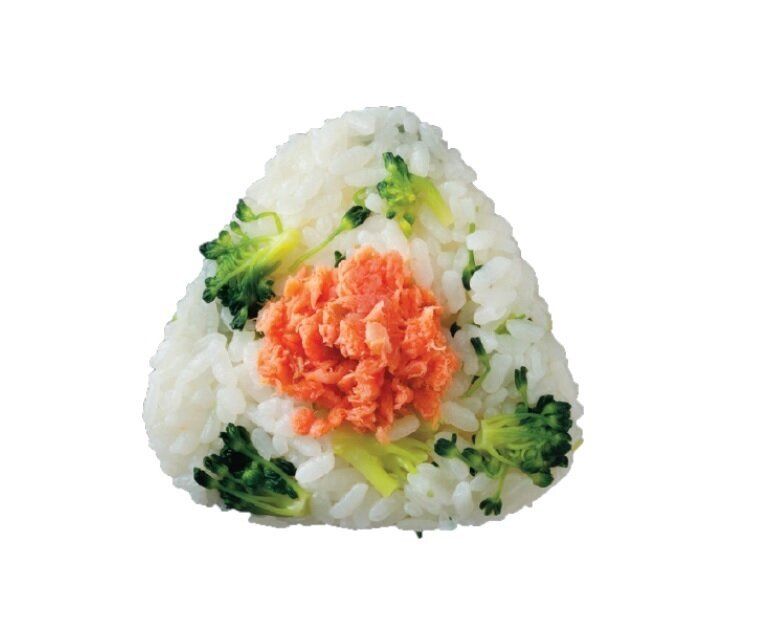 ご飯、ブロッコリー、塩を混ぜ、真ん中に鮭フレークを入れて握る。【こ】