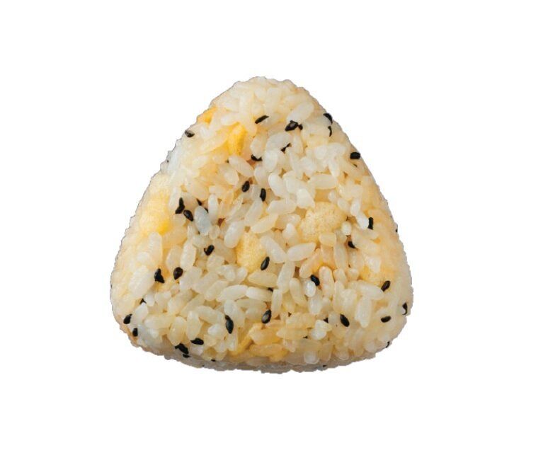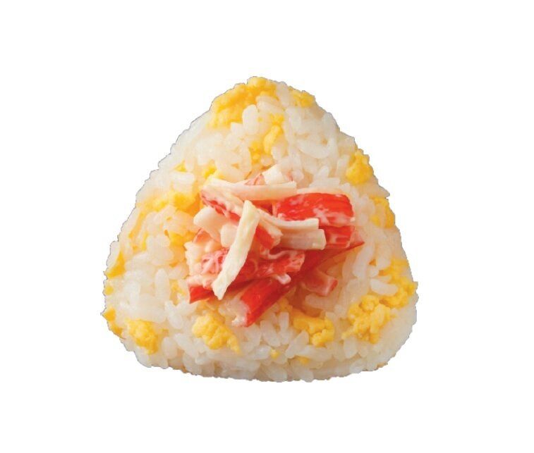ご飯、いり卵、塩を混ぜ、真ん中にマヨネーズであえたかにかまを入れて握る。【こ】