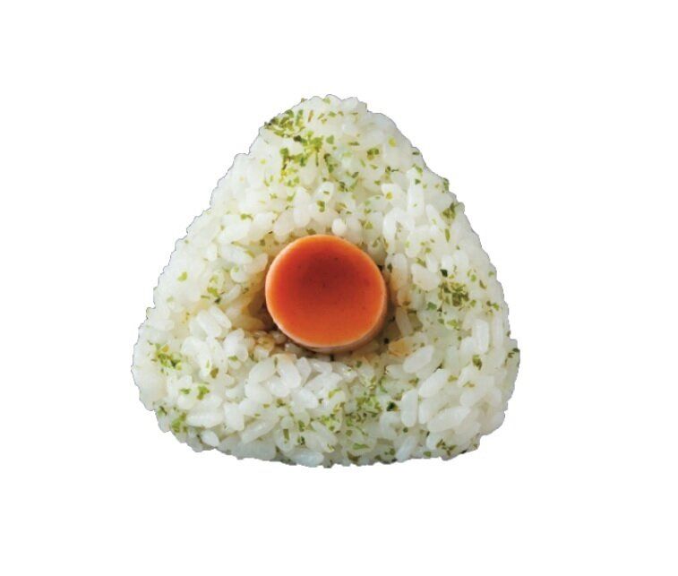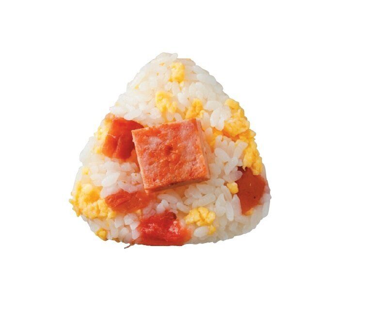 ご飯、いり卵、種を取った梅干し、塩を混ぜ、真ん中に炒めたスパムを入れて握る。【こ】