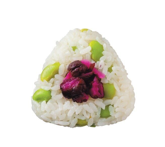 ご飯、枝豆、塩を混ぜ、真ん中にしば漬けを入れて握る。【こ】