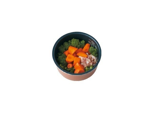 (1)ブロッコリーは小房に分け、にんじんは大きめの乱切りにし、炊飯器の内がまに入れる。鶏肉、[A]を加えて混ぜ、スイッチを入れる。