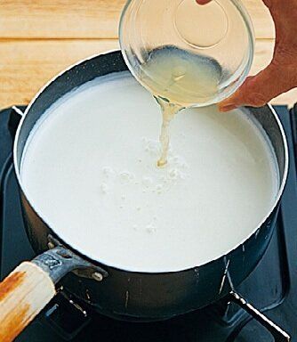 (1)鍋に牛乳を入れて中火にかけ、沸騰直前まで温めて火を止め、レモンの絞り汁を加える。
