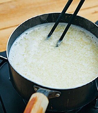 (2)(1)を、固形分と水分に分離するまでやさしく混ぜる。