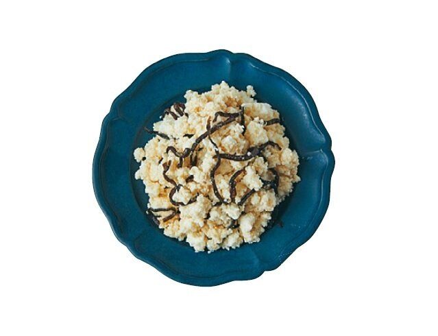 カッテージチーズ50g、ごま油大さじ1、塩昆布大さじ1/2を混ぜる。