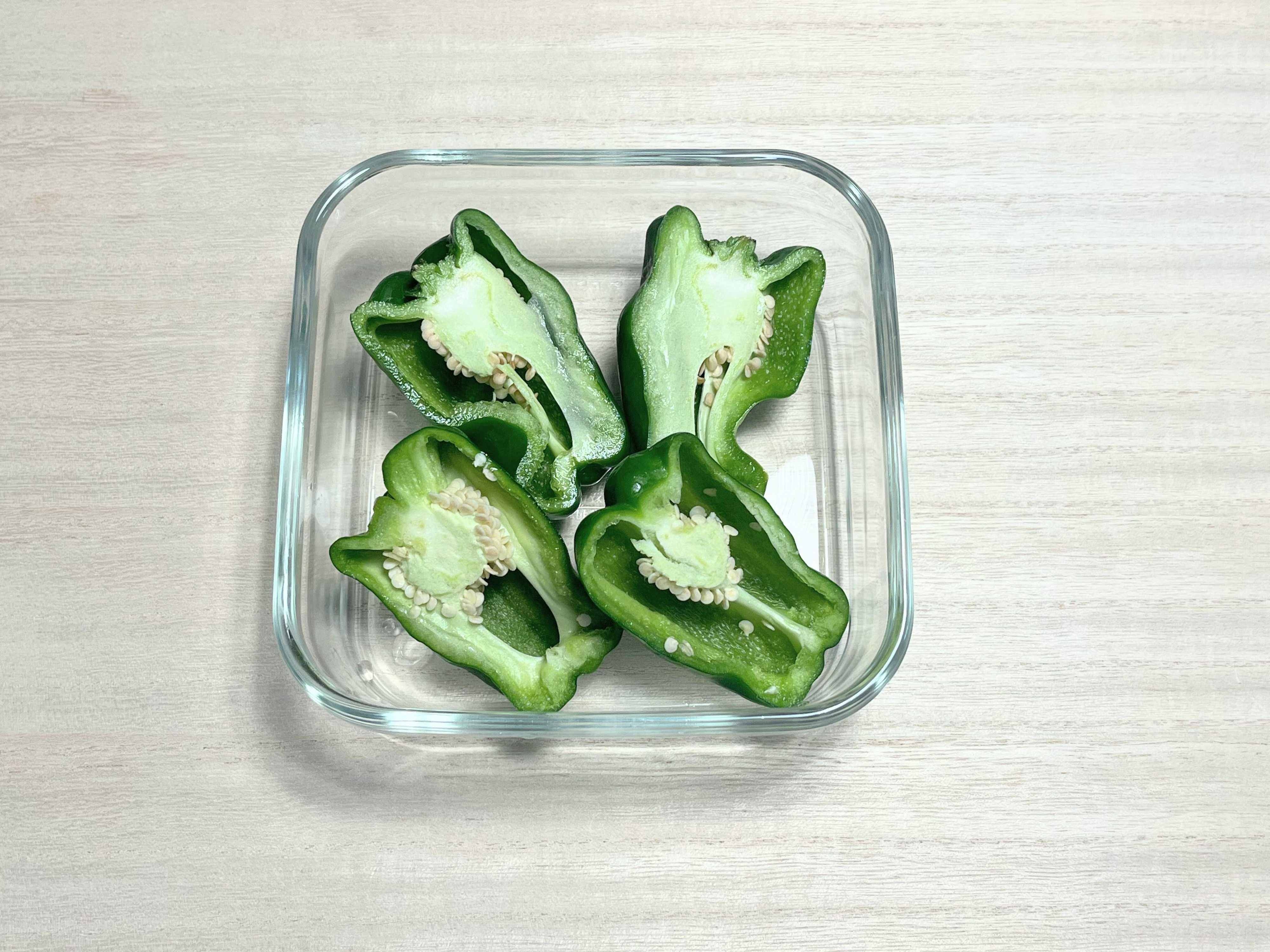 まずは、水洗いしたピーマンを半分にカットして耐熱皿へ。今回のレシピには種やワタを取る工程がありません。
