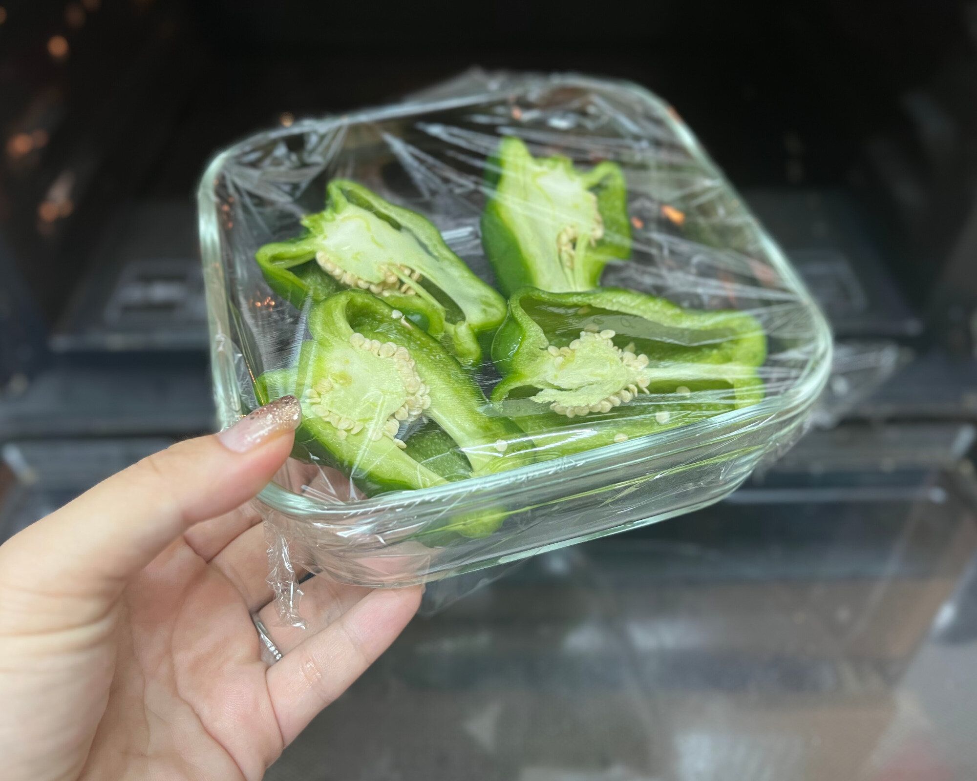 先ほどカットしたピーマンを電子レンジで調理します。加熱時間は600Wで4分間。