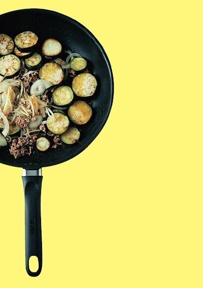 フライパンにオリーブ油とひき肉、にんにくを入れて中火で炒め、空いているところに玉ねぎ、なすを入れて焼き、塩少々をふる。なすのみ焼けたら取り出しておく。