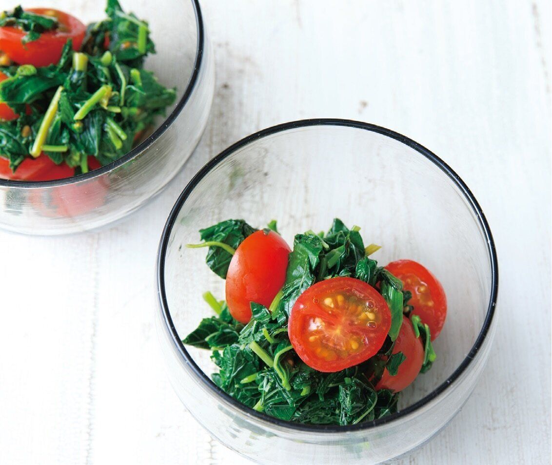 モロヘイヤは葉を摘み(太い茎は使わない)、塩少々を加えた湯に入れて1分ゆでて冷水にとり、水けを絞り、粗く刻む。ボウルに入れ、ポン酢しょうゆを混ぜる。ミニトマトを加えてあえる。