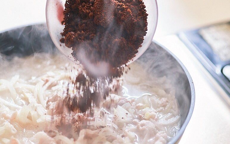 肉の色が変わってからでなく、赤い部分が残っているうちに水を加えたほうが肉のうまみが汁にうつってうまい!