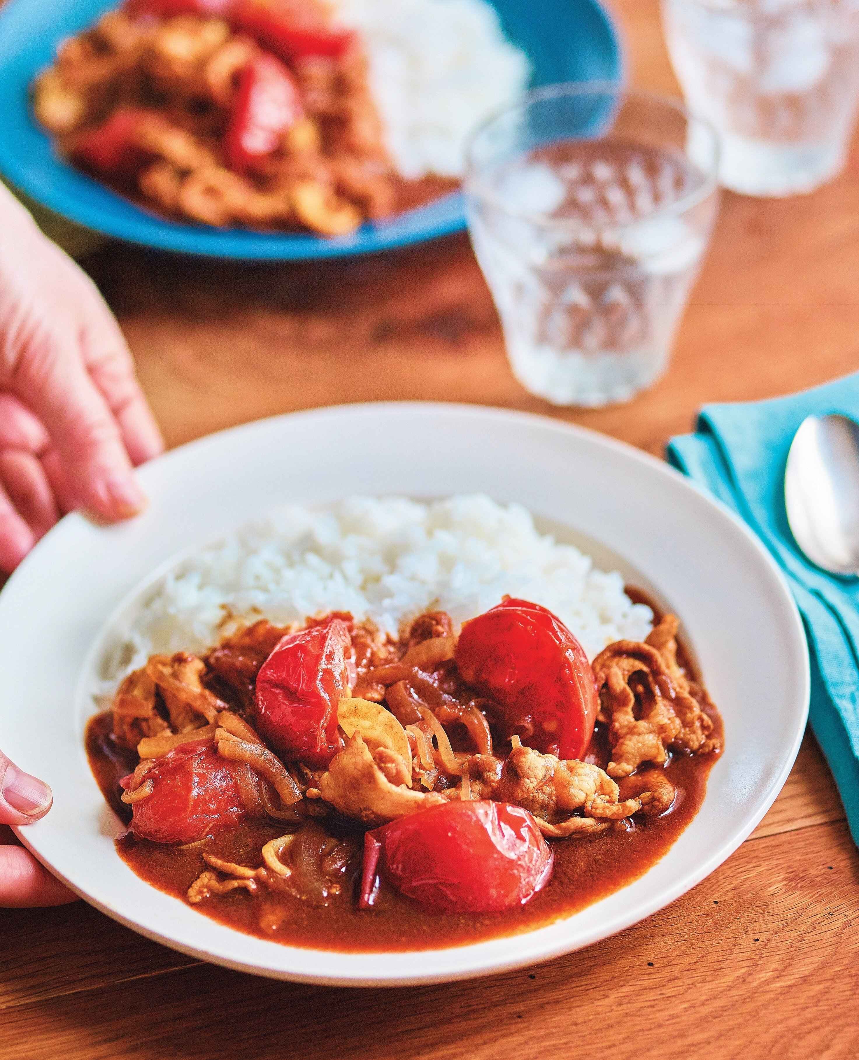 カレールウ、しょうゆを加えてルウを溶かす。トマトを加え、まわりが少しくずれるまでさっと煮る。器にご飯を盛り、カレーをかける。