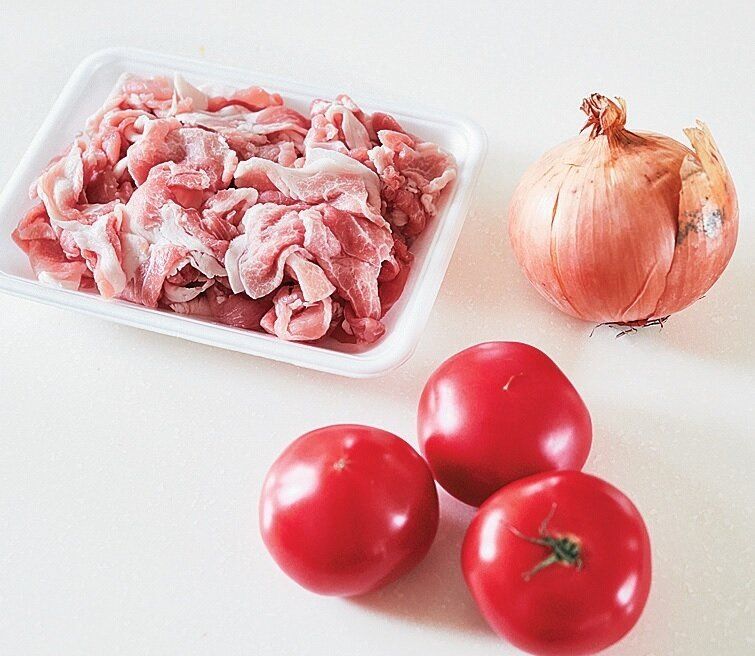 フライパンに油を強火で熱し、玉ねぎ、豚肉を入れ、豚肉の色が八分通り変わるまで炒める。